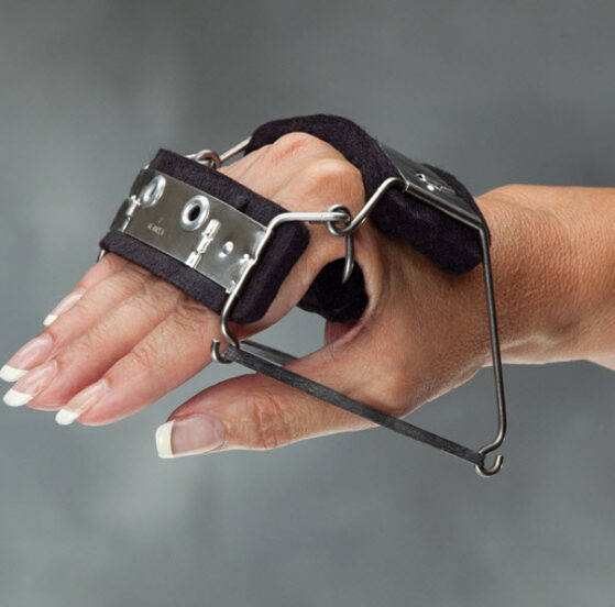 Aparat dynamicznie korygujący zgięcie, zapewniający utrzymanie stawu śródręczno-paliczkowego w pozycji przygiętej.